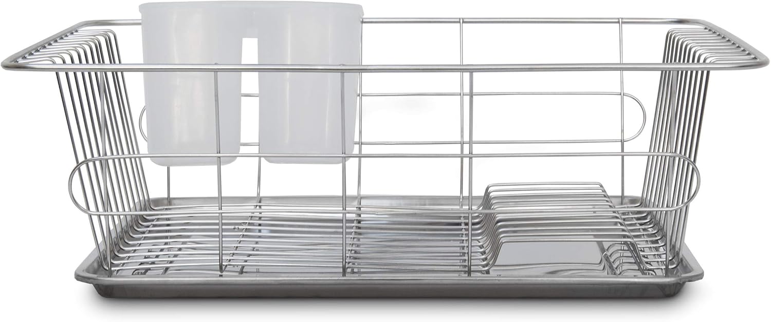 Save yourself the trouble of drying dishes by hand with this drying rack. It will air-dry your dishes for you and the drip tray underneath will prevent water from pooling on your countertops. The drying rack and drip tray are made of shiny, chromed stainless steel. These classic-looking pieces are very easy to clean. The cutlery tray is made of synthetic material and features two compartments.This dish rack is ideal for smaller kitchens with less counter space. And because of its space-saving size, the draining rack is also perfect for RV or camping trips. No More Puddles • Air-dry your dishes • No puddles of water on your countertop • Water collects in the drip tray • Classic, shiny metal look • Ideal kitchen aid • Perfect for use in the kitchen, while camping or on RV trips • Easy to transport and cleanDetails on Stainless Steel Draining Rack with Cutlery Compartment • Size: 13 x 40.5 x 30.5 cm (5.1 x 15.9 x 12 in) • Weighs approx. 0.8 kg (1.8 lbs) • Cutlery compartment: 10 x 15 x 7 cm (3.9 x 5.9 x 2.8 in) • Material: chromed stainless steel rack, plastic cutlery container • Cutlery box with hanging piece & ventilation holes • Cutlery container with 2 compartments Included in Delivery • 1 x Drying rack • 1 x Drip Tray • 1 x Cutlery container • Decorative items from product pictures not included