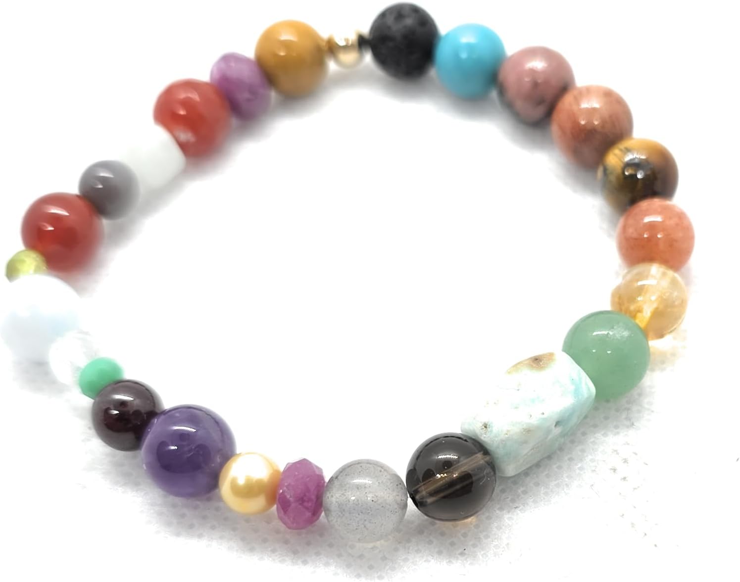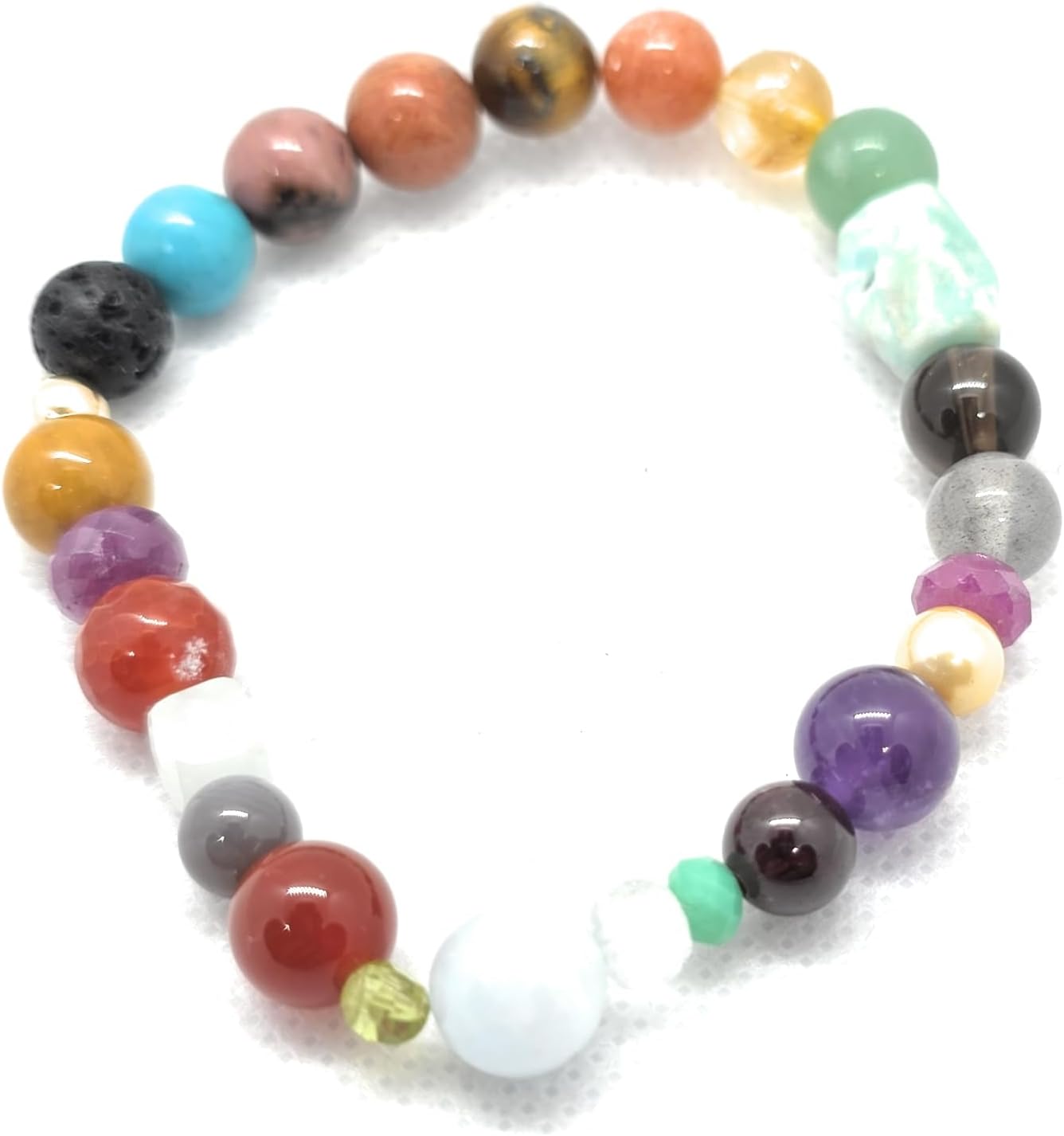 This is a revelation crystal bracelet based on the Book of Revelations in the Bible Chapter 21. All the beads are natural crystals with each having a special meaning and protection for the person who wears the bracelet. Each one is one of a kind. It includes the name of each crystal and a special blessing from me. I hope you enjoy spending time with this special bracelet for many years to come. Thank you. Starting with the gold-filled bead: Jasper, Sapphire, Chalcedony (Red Agate), Emerald, Sardonyx, Carnelian, Peridot, Aquamarine, Topaz, Chrysoprase, Garnet, Amethyst. 10PhasesofLife crystals: pearl, ruby, Labradorite, Smoky Quartz, Calcite, Aventurine, Citrine, Sunstone, Tiger's eye, Red Jasper, Rhodonite, Turquoise, Lava rock. Please visit my website: www.soulstonesaver.com to see the meaning of each crystal. Thank you. God is the Bread of Life. Who teaches us to love everyone. So we can live forever. Amen.