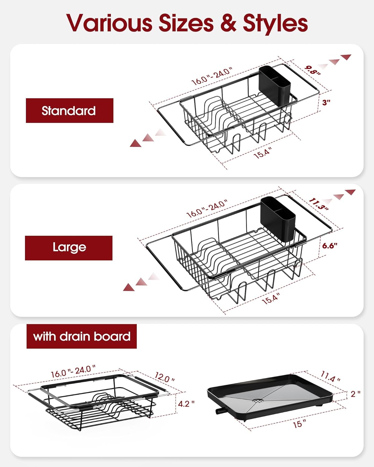 Looking for a space-saving kitchen rack? The Sakugi dish drainer for kitchen sinks is designed to keep your kitchen organized while maximizing space efficiency! Upgrade your sink area with this modern sink drying rack! 1. Measuring 15.4"L x 11.3"W x 6.6"H, this expandable utensil holder for kitchen counter features adjustable supporting bars (15.4" to 24") for a secure fit over different sink sizes. The dish drying rack for kitchen counter is equipped with non-slip rubber covers to provide extra stability and prevent unwanted movement. 2. With a removable cutlery holder, 3 dedicated cup holders, and a spacious dish rack, this kitchen sink strainer basket offers ample storage for plates, bowls, and utensils while keeping your countertop clutter-free. 3. Crafted from high-quality stainless steel with a food-safe coating, this dish drying rack over the sink resists rust and scratches, ensuring a long-lasting, pristine look. The sleek black finish of the dish rack over sink makes it a stylish addition to any small kitchen, apartment, RV, or dorm!